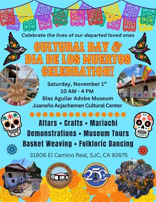 Join the Blas Aguilar Adobe Foundation at our 4th Annual Cultural Day & Dia De Los Muertos Celebration, Saturday, November 1st from 10am to 4pm at the Blas Aguilar Adobe Museum, 31806 El Camino Real, SJC. FREE to the public with the beauty of Altars, Crafts for kids, traditional Mariachi band, interactive Demonstrations, educational Museum Tours, the art of Basket Weaving, and captivating Folklorico Dancing. Bring the family and join us for an inspiring day filled with fun and learning. Do not miss this colorful and cultural experience!