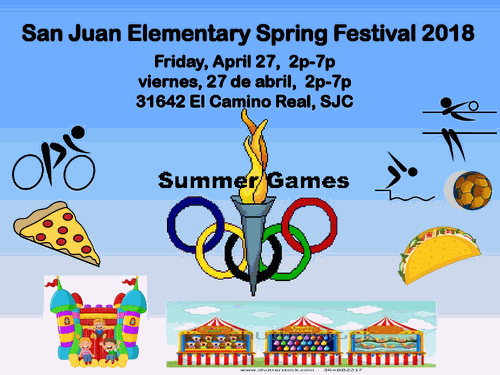 San Juan School Spring Festival Set a Reminder Enter your email address below to receive a reminder message. Email address Select the amount of Days before the event -- Select Days Before Event -- 1 Day 2 Days 3 Days 1 Week Captcha Validation Please complete the Captcha Submit Date and Time Friday Apr 27, 2018 3:00 PM - 7:00 PM PDT Location San Juan Elementary School 31642 El Camino Real San Juan Capistrano, CA 92675 Fees/Admission Purchase tickets for games and food Set a Reminder Enter your email address below to receive a reminder message. Email address Select the amount of Days before the event -- Select Days Before Event -- 1 Day 2 Days 3 Days 1 Week Captcha Validation Please complete the Captcha Submit Share × Print Email Add to Calendar Facebook Twitter LinkedIn Tell a Friend × Select Calendar Type × Google Yahoo iCal (Outlook, Apple, or other)